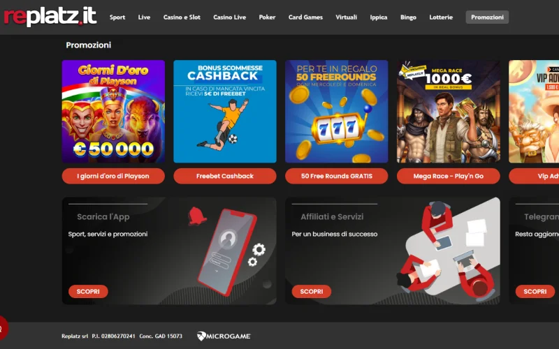 Replatz offre una vasta gamma di promozioni per gli utenti più fedeli e per i nuovi iscritti. I Replatz casino bonus sono pensati per dare ai giocatori un vantaggio iniziale e aumentare le loro possibilità di giocare. Regularmente, il casino offre bonus per la ricarica, rimborsi per le perdite e giri gratuiti su slot particolari. È essenziale esaminare tutte le offerte attualmente disponibili nella sezione “Promozioni”. Se hai un Replatz casino codice promozionale, devi inserirlo durante la registrazione o nella sezione “Cassa” prima di effettuare un deposito per ottenere l’offerta specifica.